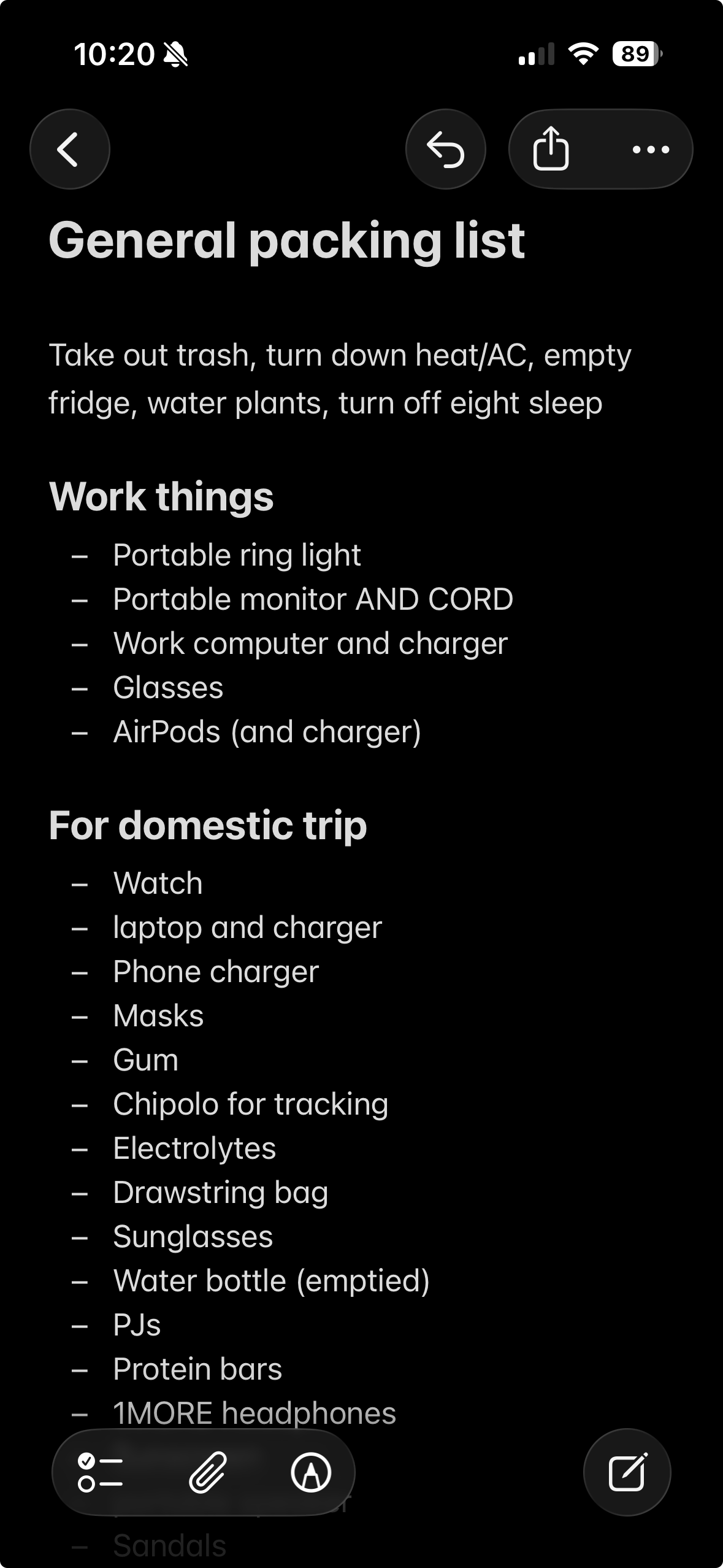 I have a comprehensive “General packing list” note on my iPhone (including a section for international trips, and a section with tips on how to sleep better on overnight). Every time I begin to pack, I duplicate that note and delete the irrelevant parts. You probably won’t forget underwear every time, but why not save yourself from the repetitive work, thinking, and room for error? Why reinvent the wheel if it’s your 5th trip in 3 months?